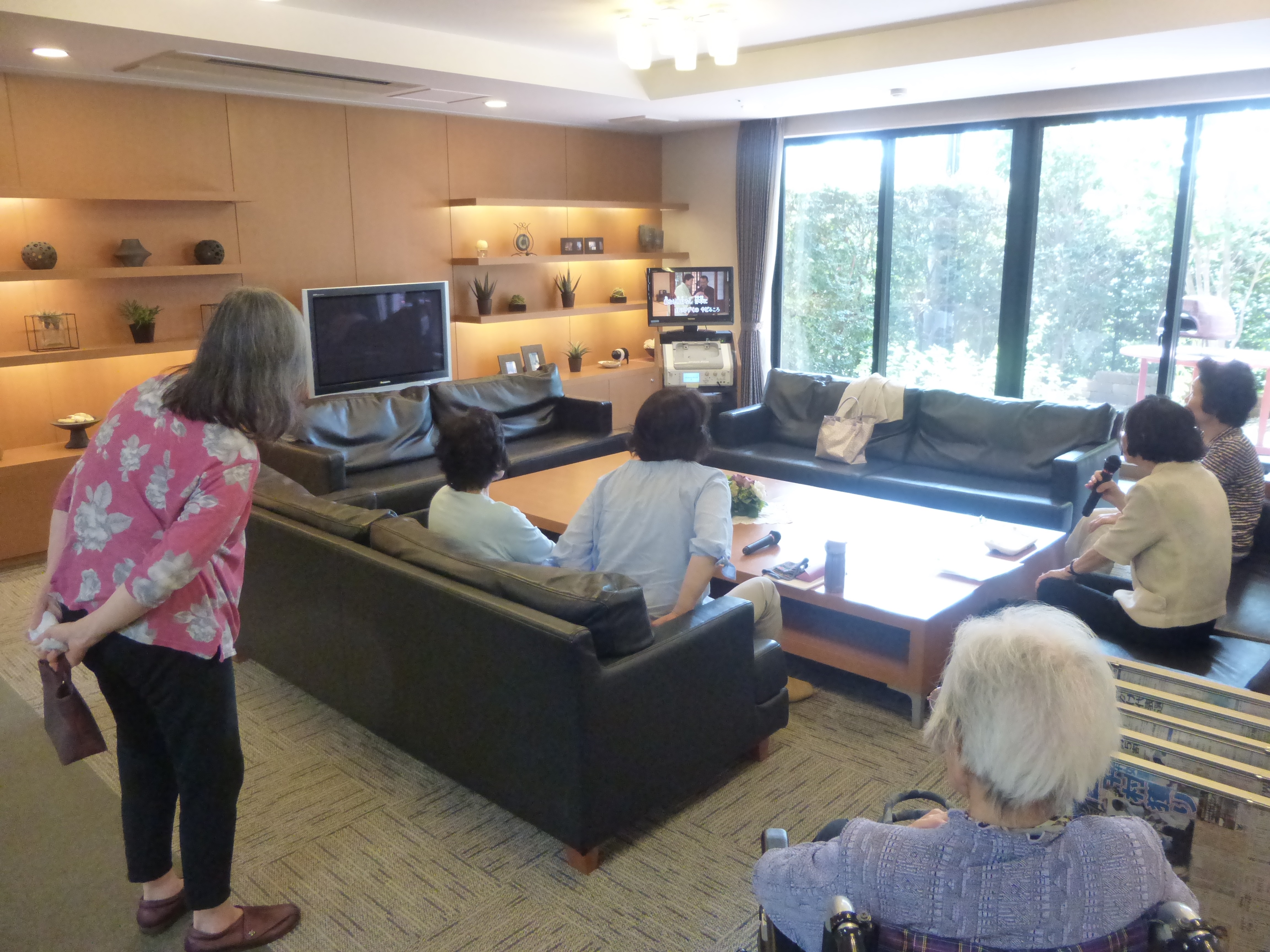 カラオケが始まると、ご入居者様も気になるようで、お一人お二人と足を止めてご参加くださり、素敵なお時間となりました。