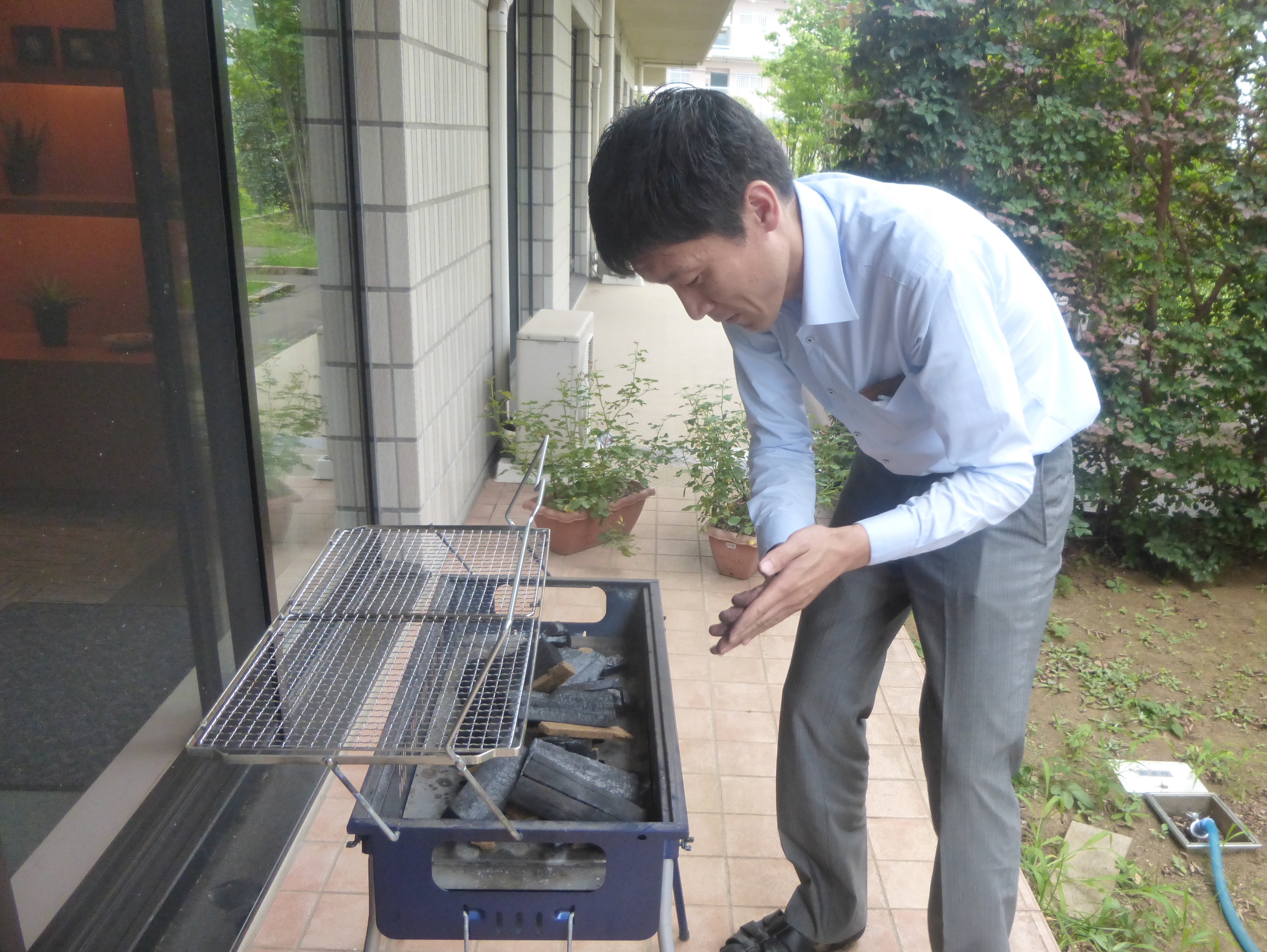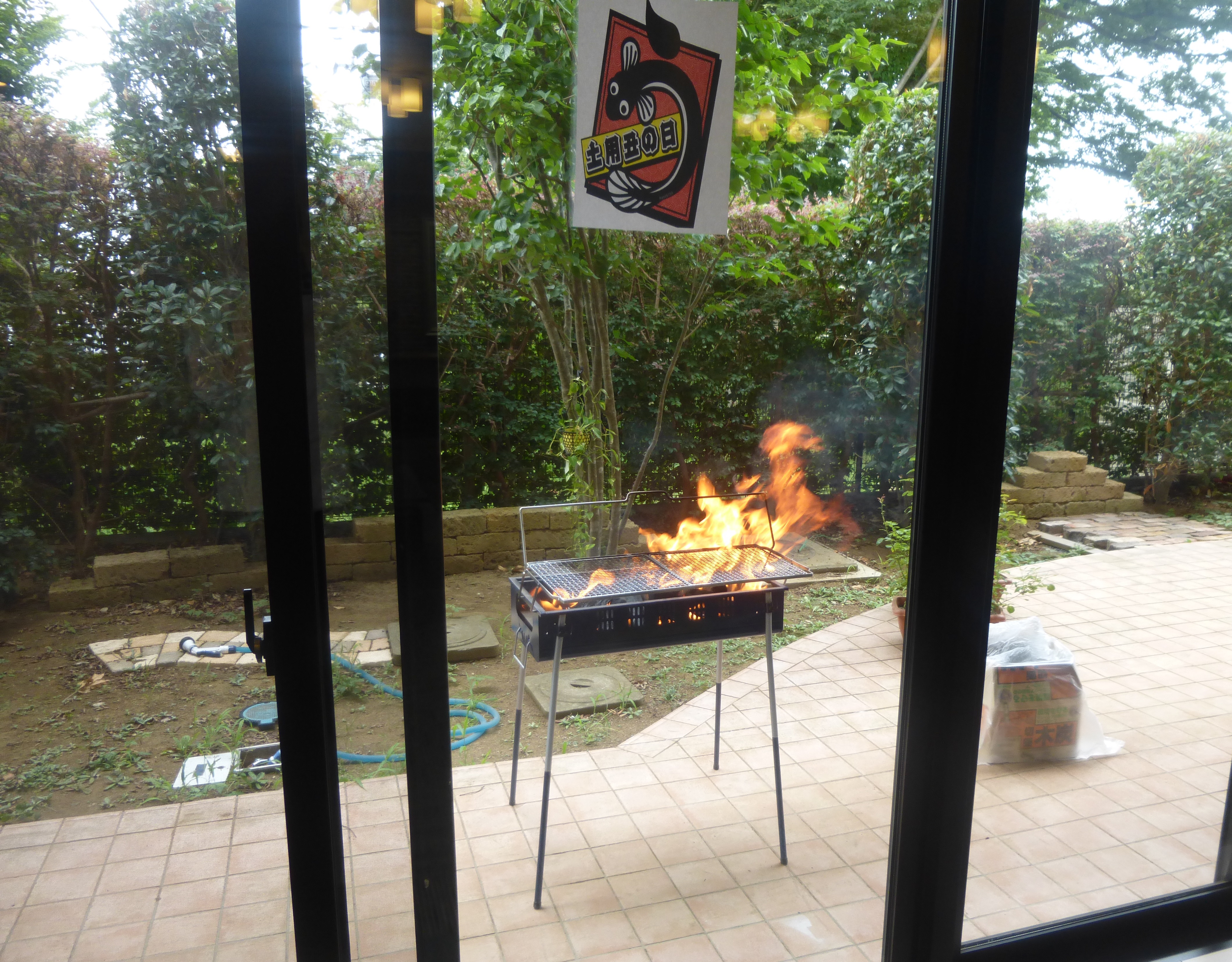普段は正面玄関の前で焼きますが、気温が高いため裏庭で行いました。