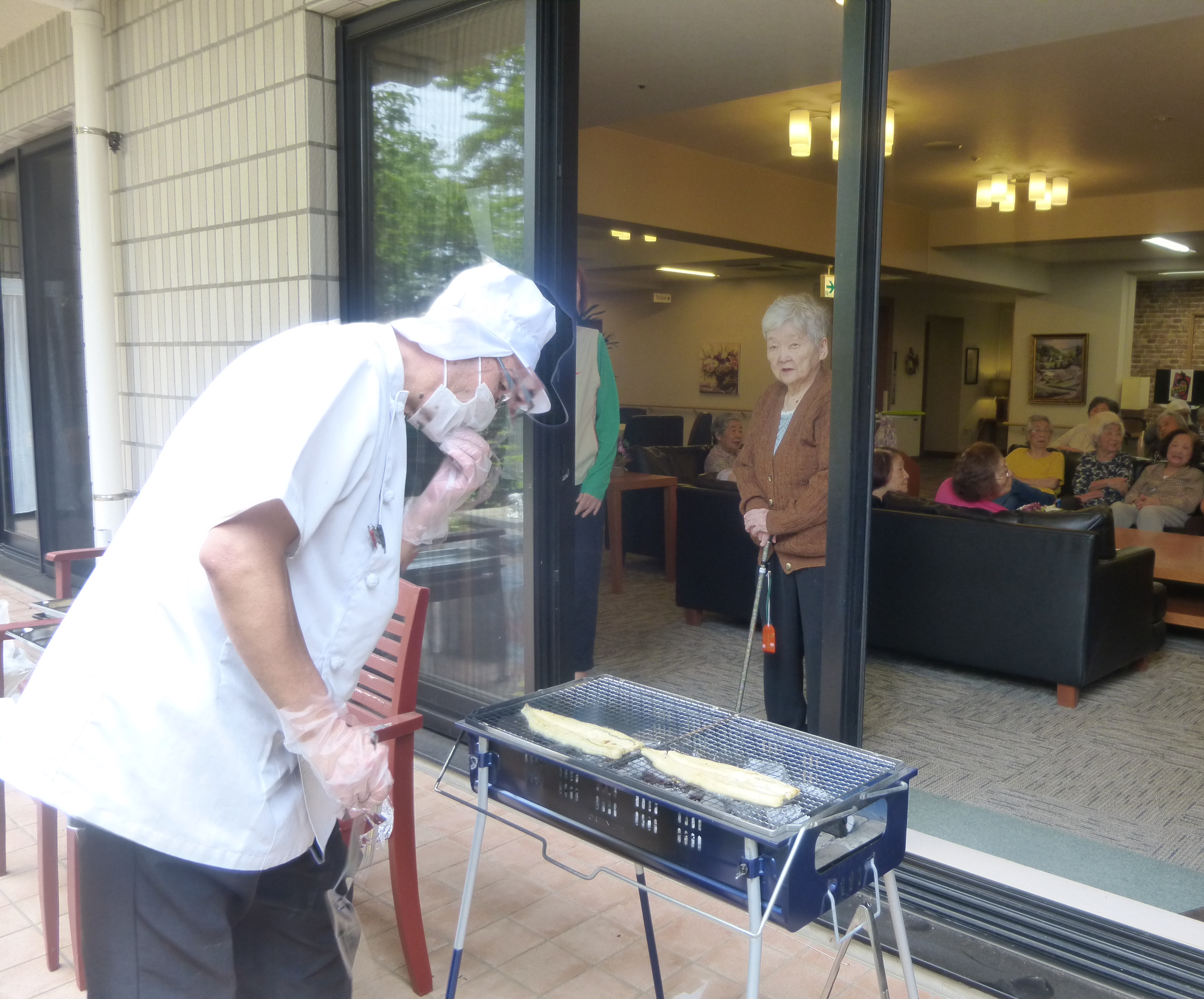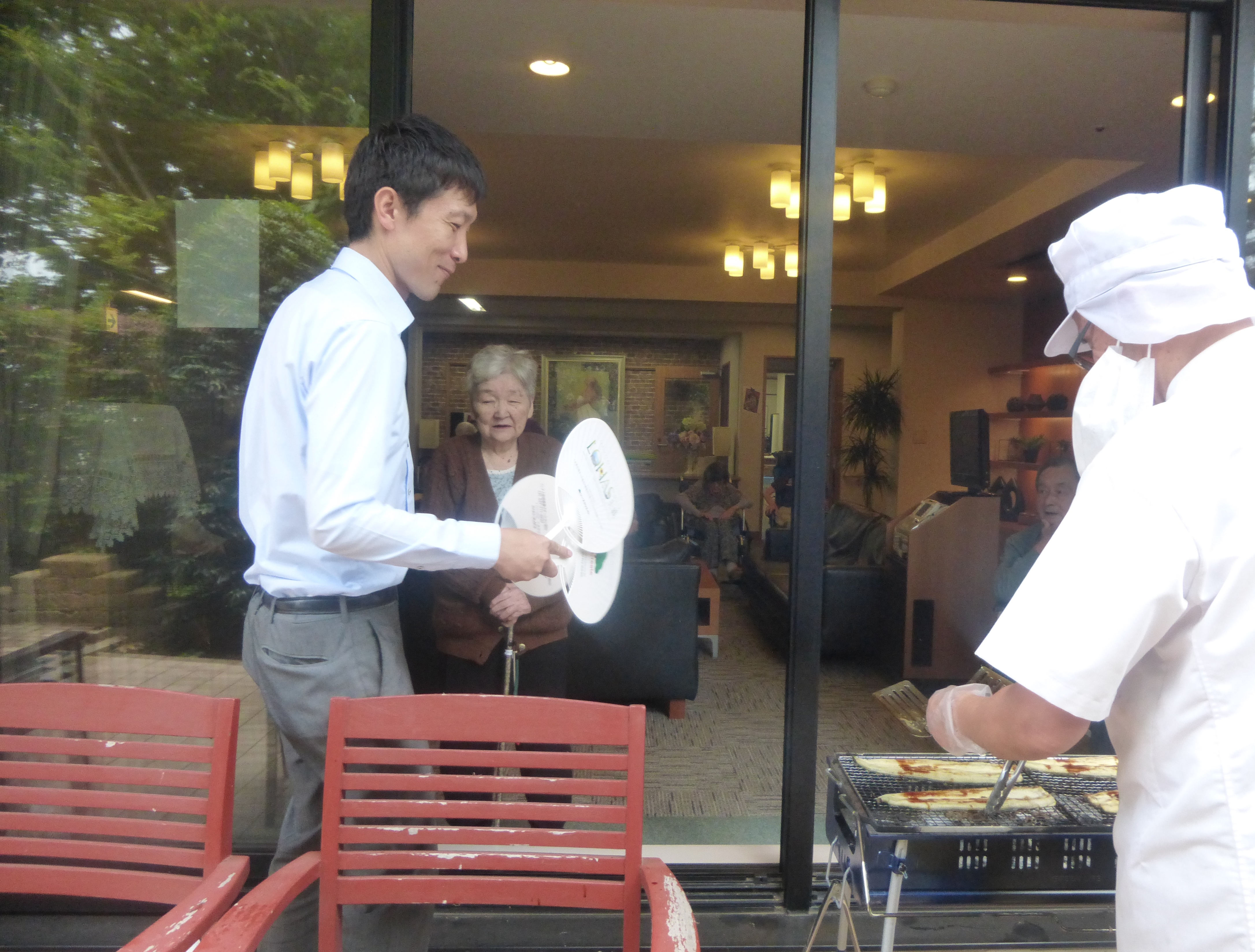 風のせいで、入居者様の方に匂いが届かず、うちわ3つ持ち扇ぐ施設長(^^ゞ