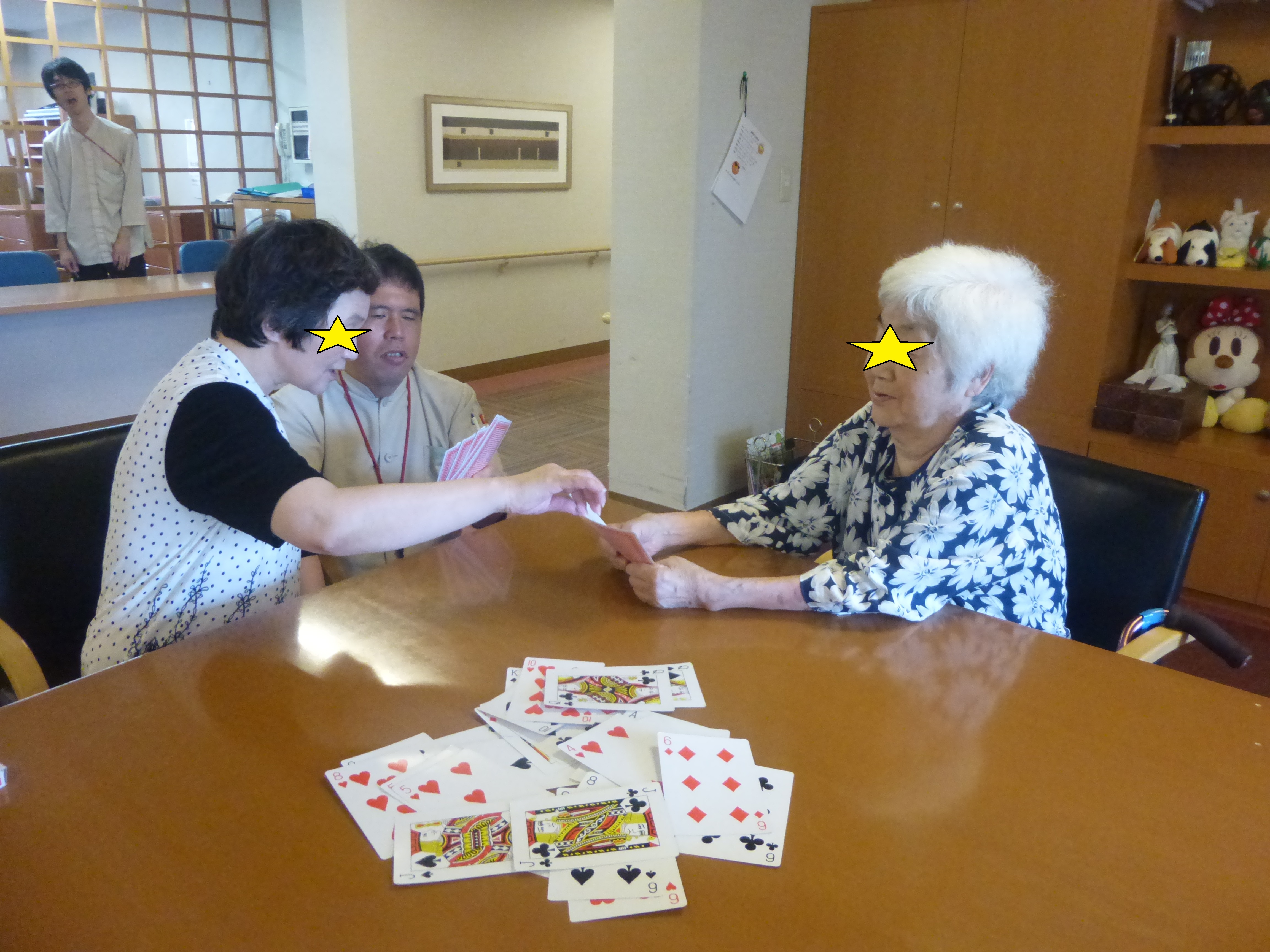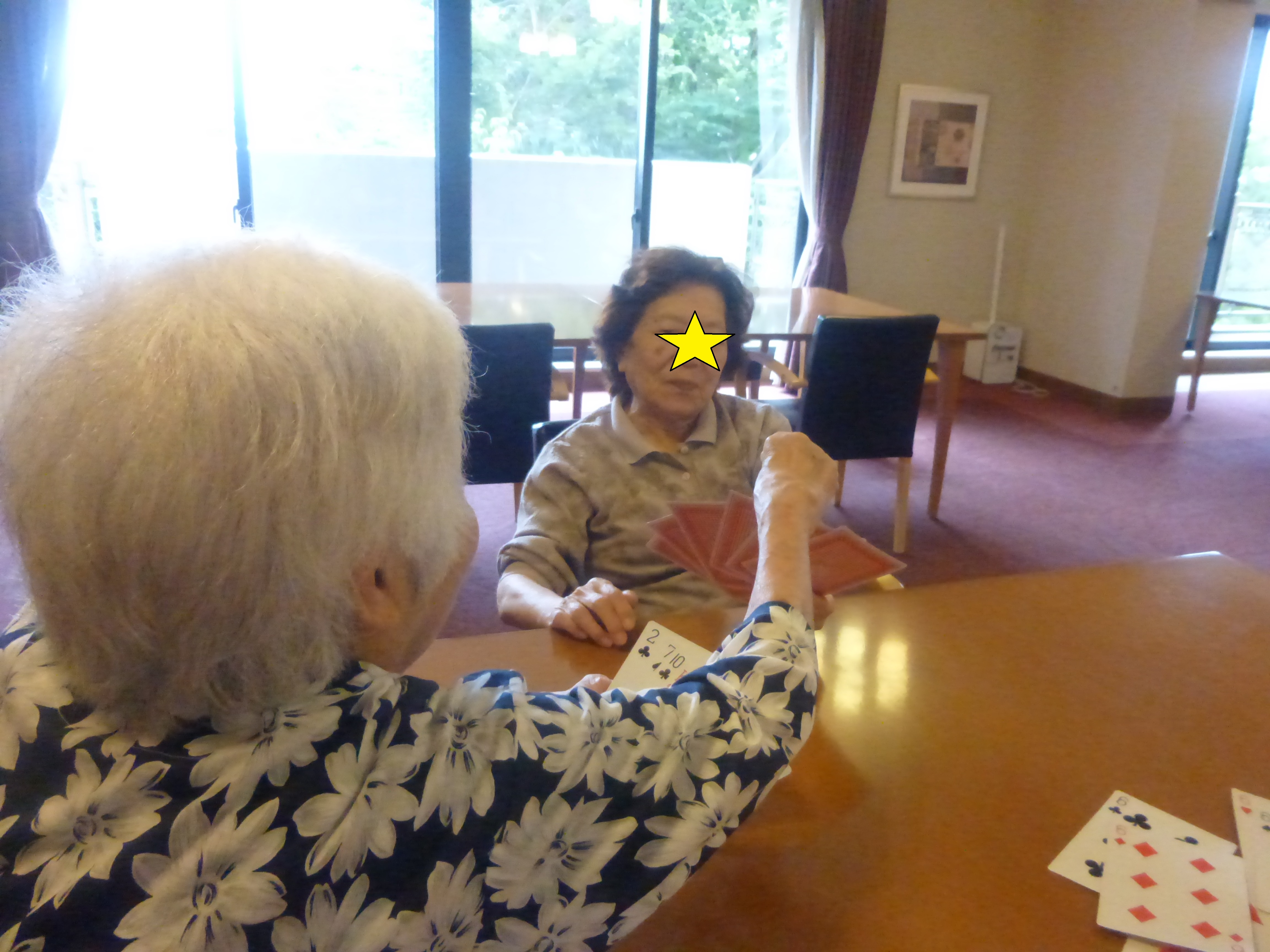 なぜか、ずっとニヤニヤしている方がおり、覗いてみるとババを持っている。