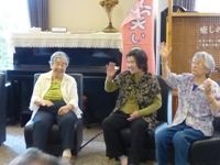 『われは海の子』『夏の思い出』と夏らしい曲を歌った後は、『青い山脈』『瀬戸の花嫁』『高原列車は行く』を歌いながら身体を動かし、『憧れのハワイ航路』『上を向いて歩こう』など懐かしの歌謡曲を数曲、そして最後は『ふるさと』で〆です。