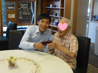 (施設長とご入居者様が葡萄ジュース片手に乾杯の図。)