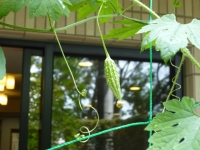 ゴーヤ選手権では幻のゴーヤで栄冠をいただくこととなりましたが、シーハーツ松戸のグリーンカーテンにもようやくゴーヤの実がなりました。