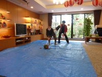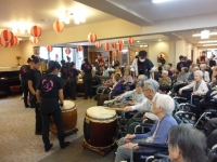 3枚目の写真は『和太鼓 きらり』による演奏の合間で入居者の方々に太鼓をたたいていただいた一コマです。