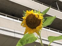 施設前のひまわりもはじめは膝ぐらいの高さだったのが、もう大人の背よりもグンと大きく伸びて元気に咲いています。