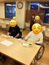 メニューは枝豆やたこ焼き(その場で焼き、できたてほやほや!)他など。本物の居酒屋さんに比べ決して多くはないですが、ご入居者様お一人おとりに楽しんで頂ける様まごころ込めて色々と準備を重ねました♪