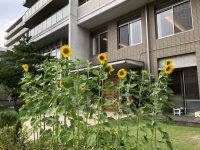 エントランスの芝生エリアでは今、ひまわりがすくすく育っています。