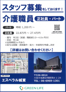 トップページ > 施設を探す > エスペラル城東 関連 介護付有料老人ホーム エスペラル城東 施設へのお電話は 06-6969-1301 9時00分~17時30分 (365日受付) 入居に関するお問い合わせ 0120-1165-14 施設の特徴 施設概要 料金プラン 施設のアルバム «前へ3435363738次へ » 2025年05月01日 ☆居室のご案内☆ いつもご覧くださり、ありがとうございます^^ さて、本日もモデルルームをご紹介します!! いかがでしょうかヽ(^o^)丿 ぜひ、モデルルームをご覧いただいて、 施設内の様子もご見学にいらしてください!! ただいま、空き室もございますので、ご案内できますので スタッフ一同心よりお待ちしております☆彡 笑顔・まごころ・感謝 エスペラル城東 電話:06-6969-1301 ★お問い合わせお待ちしております★ 関連 2025年04月30日 5月の節句の準備(^O^)/ 今日もブログをご覧いただき ありがとうございます。 今日は5月の節句子供の日の 準備をエントランス入り口にしました(^O^)/ とても大きくて迫力満点!!! 見応えたっぷりです(^O^)/ ぜひ見に来てください!! そしてお写真など撮ったりぜひしてみて下さいねーーーー!!! こちらの5月人形はオルゴールタイプとなっており 丸い部分をまわすと音楽が流れます(^_-)-☆ こちらもぜひ見に来てくださいね(^_^)/ 笑顔・まごころ・感謝 エスペラル城東 電話:06-6969-1301 ★お問い合わせお待ちしております★ 関連 2025年04月29日 スタッフ募集(^O^)/ 今日もブログをご覧いただき ありがとうございます。 今日は介護スタッフ等の募集をしたいと思います!!! 是非この機会に私たちと一緒に働いてみませんか?? 詳しくは電話等でお問い合わせください。 見学も受け付けております♪ ご応募お待ちしております!! 笑顔・まごころ・感謝 エスペラル城東 電話:06-6969-1301 ★お問い合わせお待ちしております★ 関連 2025年04月28日 ご当地グルメ 京都府編 いつもご覧くださり、ありがとうございます^^ 昨日のお昼は、ご当地グルメ編ということで、 「京都府編」でした!!! 衣笠丼ですが、京都府発祥のご当地丼だそうです。 甘辛く炊いた油揚げと青ネギを鶏卵で綴じ、飯に乗せた丼物で 字違いの「絹笠丼」、「信太丼」と呼ばれることもあるそうです☆彡 来月のご当地グルメは、「兵庫県」です!!! 楽しみです(*^▽^*) 笑顔・まごころ・感謝 エスペラル城東 電話:06-6969-1301 ★お問い合わせお待ちしております★ 関連 2025年04月27日 ヤモリちゃんのその後…… 今日もブログを ご覧いただきありがとうございます。 今日は先日のブログで更新したヤモリちゃんのその後の 様子をご紹介します(*´ω`*) 実は網戸の中にまで入ってきていたので スタッフがそのまま手の上にのせて移動させました☆彡 とても小さくおとなしく可愛いやもりちゃん♡ 花壇のあるお花の所へ移動しました(/・ω・)/ 土の上を元気に走っていきました(^O^)/ 笑顔・まごころ・感謝 エスペラル城東 電話:06-6969-1301 ★お問い合わせお待ちしております★ 関連 «前へ3435363738次へ » 近隣施設のご紹介 グリーンライフ守口 介護付有料老人ホーム ウエルハウス千里中央 介護付有料老人ホーム カリエール茨木 介護付有料老人ホーム ライフコート春秋 介護付有料老人ホーム