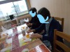 午後のティータイム、フロアにお邪魔すると、ぬりえや計算問題に真剣に
