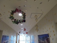 金と銀の折り紙を雪に見立て廊下一面に展示していて圧巻の風景になっています!またクリスマスの近くということでリースやボンボンなどあり一層華やかになっています!