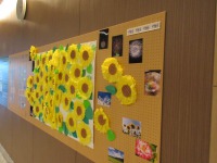 夏の花の代表格のひまわりと、薄ピンクの百合がメインに廻りにはグラジオラスなどの花が脇を締めて夏らしい華やかな作品で、コーヒーを飲みに来られる入居様にも好評です!