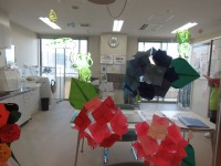 そんな6月ですが、10階では素敵な作品ができていました!先日のレクレーションで折り紙で作ったアジサイやジェルシールを使ったかわいいカエルを作って窓ガラスに貼って涼やかな雰囲気になっています!