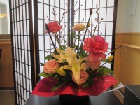 数日前に3階ロビーに到着した生け花!今回も菊やガーベラなどの綺麗な花と春らしい甘い香りで皆さんを楽しませています!また今回は桜の枝も入っていました。