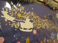 今日はある階では巨大クリスマス貼り絵に挑戦していました!約1メートルくらいの大きなキャンバスにフロアの皆さんとスタッフでわずか2時間で作り上げた力作です!