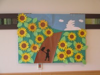 ある階では入居者様とスタッフが協力して大きな切り絵を作られ、迫力あるひまわりや草原の作品が飾られています♪