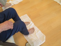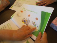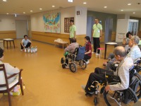 14名様が参加され、デイサービス所長と理学療法士による転倒しないための運動を皆さんで行いました。足の指先でタオルをたぐり寄せる運動、ペアになって足裏を合わせて動かす運動や肩を借りて太ももを前後左右に動かす運動など。わいわい楽しい雰囲気の中で楽しんで運動されていました。