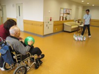今日はペットボトルボーリングです!入居者様とスタッフが混合で2チームに分かれ、倒したピンの合計で勝負を決めます♪ボールも大きいカラーボールと布製のボールの2つ。それぞれ重さや大きさが違うのでなかなかまっすぐにボールが転がらず。。。