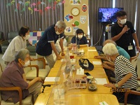 本日の午後はビンゴゲームを行いました。利用者様一人ひとりに「夏と言えば思い付く言葉」を考えて頂き思い付いた単語を白紙の16個のマスにそれぞれ書いてもらいました。これがビンゴゲームの紙になります。この後、利用者様に一人ずつ、書いた単語を発表していってもらい自分が書いた単語と同じならマスが捲れていき皆さんがビンゴするまで実施しました。最後に早くビンゴになった3名様にメダルやトロフィーを持って頂き記念撮影をしました。次回もまたやりたいと思います。お疲れ様でした(^-^)