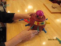 今日の午後、「お手玉」「ジェンガ」「黒ひげゲーム」「将棋崩し」を皆さんで行いました。それぞれ最初に遊んでみたい場所に移動している頂き、スタッフが見守りをしました。「ジェンガ」を始めた所は静かに始まり歓声で終わっていました。「お手玉」の所は歌声が聞こえて来ました。「黒ひげゲーム」では笑い声が聞こえ、「将棋崩し」は「あー」と聞こえて来ました。皆さんとても楽しそうにされていました。次回もお楽しみに(^^)/