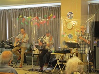 今日は慰問演奏会で「でんきくん」の皆さんいらして演奏会をしてくださいました。「憧れのハワイ航路」「高原列車」と元気の出る曲から始まり利用者様の気持ちも盛り上がってまいりました。四季を感じさせる歌を4曲皆さんと歌いしっとりとした「神田川」「武田の子守歌」迫力ある「コンドルは飛んで行く」を演奏してくださいました。沖縄の曲三曲は三線で奏でて頂き沖縄の景色が思い浮かぶようでした。最後の曲「上を向いて歩こう」では皆さんが口ずさむ様子がうかがえました。アンコールの「満天の星」では振り付けを皆さんでしたので一体感が生まれました。とても楽しい時間を過ごし皆さん満足しているようでした。次回も楽しみですね(^_-)-☆