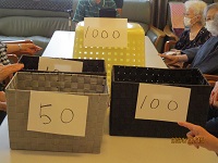 今日の午後は運動レクでピンポン玉ゲームを行いました。今回もスタッフが手作りをしてくれました。手前に50点、その奥に100点、小さい箱に入ると1000点としました。皆さんなかなか難しいと思っていましたがなんと!!!1000点を2回入れる方がいました。拍手と歓声が上がりとても盛り上がりました。次回も楽しい時間を過ごしたいと思います(^_-)-☆