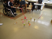今日の午後は運動レクでペットボトル倒しゲームを行いました。棒の先に紐を長めに付けその先にボールを括り付けました。棒を振ることでボールが動きペットボトルが倒れます!皆さんには椅子に座って頂き棒を振って10本あるペットボトルを何秒で全て倒せるかを競って頂きました。初めて行いましたので「わあー凄いじゃない!」「もう少しよ!頑張って!」と皆さんとても盛り上がりました。またしましょうね(*^^)v