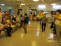 今日は、皆さん楽しみにしている音楽療法の日です♪まず初めに「秋」ということで「里の秋」を皆さんで歌いました。次にダンス付きで「365歩のマーチ」!皆さん振付を覚えるのが早い!「かかし」「まっかな秋」「夕焼け小焼け」に続き「リンゴの唄」は皆さんに歌ってもらいながら楽器を使い演奏して頂きました。スズ、マラカス、タンバリン、いろいろな楽器を使っての演奏です。こちらも先生が驚くほど上手にそろっていました。最後は、「星影のワルツ」を歌って締めくくりました。とてもいい時間となりました♪♪♪