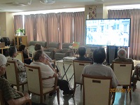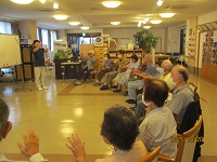 本日の午後は皆さんが楽しみにしている「音楽療法」です。いつもの「世界の国からこんにちわ」のグリーンライフバージョンから始まり、「小さい秋見つけた」「虫の声」「赤とんぼ」など秋の歌を皆さんで元気良く歌いました。途中で利用者様に楽器を自由に鳴らしてもらったり、身体も動かしながら楽しんでもらいました。次回も楽しみにしていて下さい。お疲れ様でした(^-^)