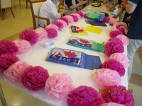 今日の午後は来月行う夏まつりの壁画を作り始めました!お花紙で花を作り文字を作っていきます。文字の色の配色を利用者さんが『こうした方が目立つわよ!』と提案してくださいました☆みなさん丁寧で手早いので進みが早いです!!今日だけで半分くらい出来上がったので次回には出来上がりそうです(^-^)