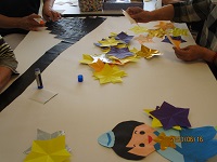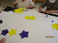 今日の午後は来月の壁面制作を行いました。構図は出来ていたのですが中々取り組めず今月中に出来上がるのか?とスタッフは思っておりましたがなんと!!!今日の利用者様がとても頑張ってくださり出来上がりがもうすぐです。「ここの星が足りないわよ」「空の折り紙も足りないわよ」とスタッフの手が間に合わない程でした。皆さんのおかげでこんなにも進みました。出来上がりが楽しみですね(^^♪