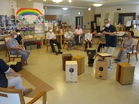 本日はスタッフによりカホンという楽器の演奏会をして頂きました。カホンとは南米のペルー発祥の箱型の形をした打楽器だそうです。スタッフにカホンの叩き方を披露して頂き、利用者様は真剣な表情で見入っていました。利用者様に一人一個ずつカホンを用意し皆さんスタッフの動きを見ながら叩かれておりました。普段あまり見ることのない楽器で少し難しかったかもしれませんが・・・お疲れ様でした(^-^)