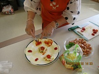 今日の午後は皆さんが楽しみにされている手作りおやつの日です!!今日は、餃子の皮を使ったピザを利用者さんにも手伝っていただきながら作りました。材料は餃子の皮、玉ねぎ、ピーマン、ウインナー、トマト、チーズです。ケチャップを塗った餃子の皮に玉ねぎ、ピーマンを細かくしたもの、ウインナー、トマトを切って乗せてチーズをかけてホットプレートで焼きます!皮がパリパリして具のところはしっとりにできあがりました(^^♪「みんなで作ると楽しいわね」と楽しく作って頂くことができてよかったです♡「可愛いわね」「オシャレでおいしい」とおかわりをして下さる方もいました☆次回は何を作ろうか考えておきますね!また、お手伝いもお願いしたいと思います(^^)/