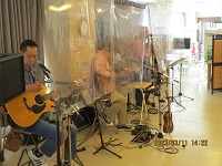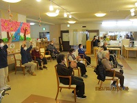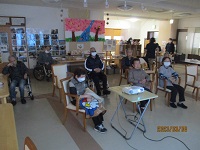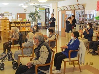 本日は感染対策をした上で約2年半ぶりにでんきくんが来て下さいました。フォークソングと沖縄の曲、合わせて10曲を演奏して下さいました。1曲目の憧れのハワイ航路から始まり6曲目の知床旅情までしっとりとした曲を皆さん静かに聞き入っておりました。後半の7曲目からの3曲は沖縄の曲を三線を使われ演奏して下さいました。今日一番盛り上がったのは最後の満天の星です。簡単な振り付けがあり利用者様はもちろんスタッフも一緒に盛り上がりました。次回が待ち遠しいです。楽しみにしています(^^♪