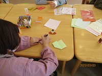本日は3月3日のひな祭りの為、利用者様に折り紙で雛人形を作って頂きました。皆様に好きな色の折り紙を選んで頂きスタッフが教えながら折ってもらいました。雛人形の顔は皆さんそれぞれ自由に書いてもらいましたがとても個性が出ていたように思いました。「うちに帰ったら飾ろう。」と仰られている方も居ました。皆さん熱心に、また楽しそうに取り組まれておりました^m^