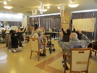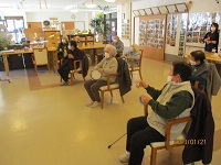 本日は今年初めての音楽療法をしっかり感染予防対策をした中で行いました。全部で9曲ピアノ演奏をして頂きました。最初は世界の国からこんにちわを身体を動かしながら行いました。その後先生から「初日の出を見た方居ますか?」との問いに、「自宅の前で見ました。」と仰られておりました。その後、皆さんで1月1日や津軽海峡冬景色等を歌われました。また、楽器を一人一つ持って頂き、スキー、お座敷小唄を音楽に合わせて自由に鳴らしてもらいました。本日の音楽療法も皆さん楽しく参加出来たと思います。次回は2月17日を予定しています。
