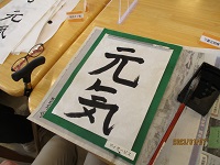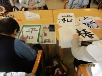 本日のレクは今年初めての利用者様に書初めをして頂きました。お題は、ご本人の好きな文字を書いて頂きましたが何を書こうか悩んだ末、『平和』『元気』に決まり書き始める筆に緊張されていましたが、何枚か練習すると柔らかい文字を書かれ、ご本人も満足されたようです。皆さん書き始めは緊張されていましたが思い思いの文字を書き良い作品が出来上がりました(^_^)