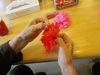 今日の午後のレクは、運動会準備としてプログラム作成をして頂きました。下書きした文字をマジックでなぞり下書きの鉛筆の部分を消しゴムで消したり、プログラムに貼り付ける飾りを、お花紙で作って頂きました。運動会の準備がこれで完了!当日が楽しみです(^^♪