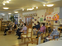 今日は、久しぶりに皆さん楽しみにしていた音楽療法♫です。皆さんが知っている秋にちなんだ歌を歌いました。♪真っ赤だな~真っ赤だな~つたの葉っぱも真っ赤だな~♪歌い終わった後には、童心に返りました、、と喜ぶ方や、マスクの中だけど大きく口を開けて歌えました(^^)/など喜んで頂けた声が聞こえてきました。歌を聴いたり歌ったり、楽器を鳴らしたり・・音楽はいいですね(^^♪来月も音楽療法が出来ます様に・・・(^^♪