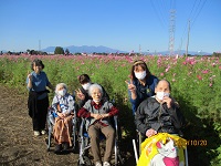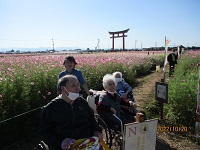 今日の午後は外出レクで、コスモス見学に出掛けました。コロナ感染拡大により警戒度が中々下がらず予定が延期になっていましたが今日は天気も良く念願の外出にコロナ感染予防対策をしっかりして出掛けてきました。小泉コスモス畑に到着すると鳥居とコスモスのコラボがとてもきれいで利用者様から「鳥居とコスモス素晴らしいね!」と感動の声が上がりました。一面に咲く色鮮やかなコスモスの花に暫し見入ってしまいましたが外出で気分転換が図れ楽しめたようです(^^)/