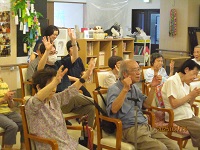 本日の午後は慰問レクで「でんきくん」が来て下さいました。定番の「高原列車」から始まり「糸」「神田川」「なごり雪」などのフォークソング、利用者様からのリクエスト曲で吉田拓郎の「今日までそして明日から」を演奏して頂き、リクエストした本人も聞き入っていました。ありがとうございます。その後沖縄の歌を歌って頂き、最後はいつもの「満天の星」を振り付けに合わせながら踊り、大変盛り上がりました。暑い中お疲れ様でした。また次回もよろしくお願いします(^-^)