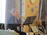 今日の午後は慰問演奏会でAKOさんのジャズ演奏を鑑賞しました。お馴染みの「あぁ人生に涙あり」でスタートです!!今回の楽曲は映画やミュージカル、オペラの曲を多めに♬シェルブールの雨傘・私のお気に入り・サマータイム・明るい表通り・ベサメムーチョ他ジャズナンバーからA列車で行こう、モーニングを演奏、今回も素晴らしい演奏で利用者様も手拍子や体でリズムを取りアンコールは♪涙を拭いて♪で盛り上がり1時間の演奏会を楽しんで頂けました!次回はどんな楽曲か楽しみです(^^♪