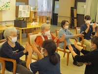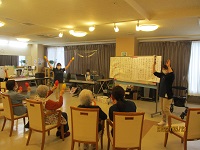 今日の午後は音楽療法の日でした。「世界の国からこんにちは」から始まり、歌いながら体を動かしたり(^^)/初夏の歌をリズムをとりながら歌い楽しまれていました。「茶摘み」では手遊びをして、楽器を歌に合わせて鳴らしたり最後「星影のワルツ」さようならと(^^♪『楽しかったよ』『よかったよ』と前回同様に話されていました。☆次回も楽しみにしていて下さい。(^_-)
