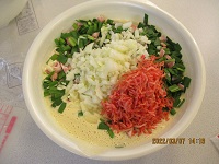 今日は皆さん大変楽しみにしている手作りおやつの日です。本日のメニューはリクエストの多い「チヂミ」です。材料はチヂミ粉、玉ねぎ、小えび、ニラ、ベーコンです。全ての材料を細かく切り粉と混ぜてホットプレートで焼きました。本日も皆さんに好評でおかわりされる方が多かったです。次回も美味しいおやつを提供したいと思います(^_-)-☆