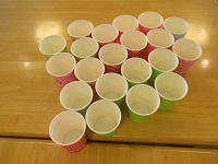 今日の午後のレクは運動レクでピンポン玉入れゲームを行いました。ルールは簡単でピンポン玉を点数の書いてある紙コップに投げるだけ、優しく投げても、強く投げてもダメです!丁度いい加減で投げないとコップからはみ出してしまいます。皆さんに高得点を取ってもらいましょうと200点と書いてあるカップを一番前に置きましたがこれがなかなか難しい。今回も皆さんで盛り上がりました。次回も楽しみにしたいです(*’▽’)