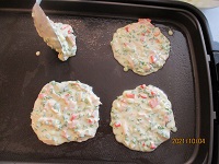 今日は皆さん大変楽しみにしている手作りおやつの日です。本日のメニューは「チヂミ」です。材料はチヂミ粉、玉ねぎ、パプリカ赤、ニラ、ベーコンです。全ての材料を細かく切り粉と混ぜてホットプレートで焼きました。チヂミは皆さんに好評でおかわりされる方が多かったです。次回も美味しいおやつを提供したいと思います(^_-)-☆