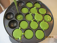 今日は皆さんが楽しみにしている手作りおやつの日です。本日のメニューは…簡単♪鈴カステラです。材料はホットケーキミックス、卵、牛乳、抹茶、ベビーチョコ、甘納豆です。抹茶には甘納豆、もう片方にはベビーチョコを入れ2種類にしました。皆さん、「抹茶の香りがして美味しいですよ」「おかわりはありますか?」等喜んでいただきました。次回も美味しいおやつを作りたいと思います(^_-)-☆