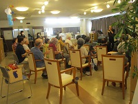 今日の午後は慰問レクでAKOの皆さんが来てくださいました。皆さんから「カッコイイよ!」「待ってました」と声がかかり「A!K!O!」と始まりました。「青い山脈」「高原列車」「月がとっても青いから」では手拍子が出て口ずさんでいる方もいました。「有楽町で逢いましょう」「夜霧よ今夜も有難う」は皆さんしっとりと聞き入って、アンコールの「涙を拭いて」は身体を揺らして聞いていました。皆さんとてもいい時間をすごせたようでした。次回も楽しみにしたいですね!(^^)!