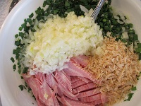今日は手作りおやつの日でチヂミを作りました。材料はチヂミの粉、にら、玉ねぎ、小エビ、ベーコンです。切って混ぜて焼くだけなのですが、毎回皆さんに好評でおかわりをされます。今回も沢山焼き、食べて頂きました!「もちもちしていて美味しいね」「来週もチヂミが食べたい」等の声を聞きました。次回も楽しみにしてほしいですね(*^_^*)