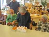 今日は、昨日好評だった「ピンポン玉入れ」を行いました。今日の方には、利き手と違う手で行ってもらいました。お一人だけ左利きの方がいましたので、その方のみ右で行いましたが、これがまた、その方が優勝しました。ピンポン玉は、滑るので以外と難しく皆様、四苦八苦されていました。良い手のリハビリになりました(^-^)