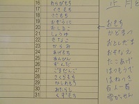 今日の午後は頭の体操で脳トレをしました。♪もういくつ寝るとお正月~♪という事で・・・「お正月といえば」をお題に思いつく事を出していただきました(^o^)/「今はしないかね~」と言いながら、羽根つき!凧上げ!餅つき!とたくさん挙げてくださいました。残りの時間は、子供の頃にしていた遊びを挙げてもらい「ゴム跳び」の話で盛り上がりました(^o^)/昔やっていた遊びがまた出来たらいいね(^_^)と話されていました!